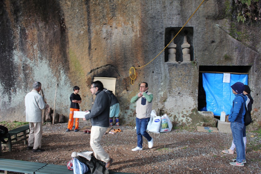 石室前で準備と受付を行う地元の方々とボランティアの皆さん。足元の袋には、石風呂に用いる薬草・石菖(せきしょう)が入っている。石室上部には宝塔と梵字が残り、石風呂が仏教文化と深く結びついていたことを今に伝えている。